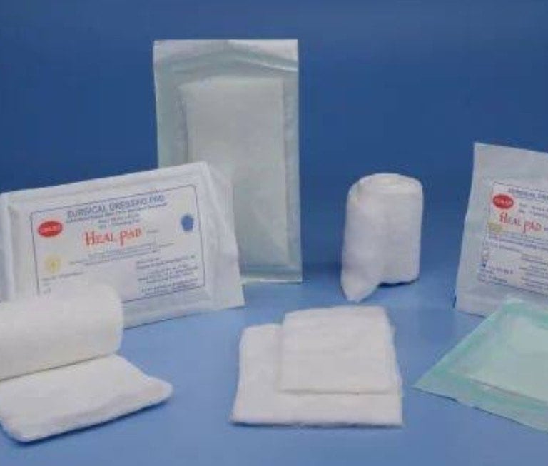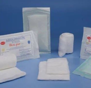Sterile medical supplies like gauze, bandages, and pads used for surgical procedures and wound care.